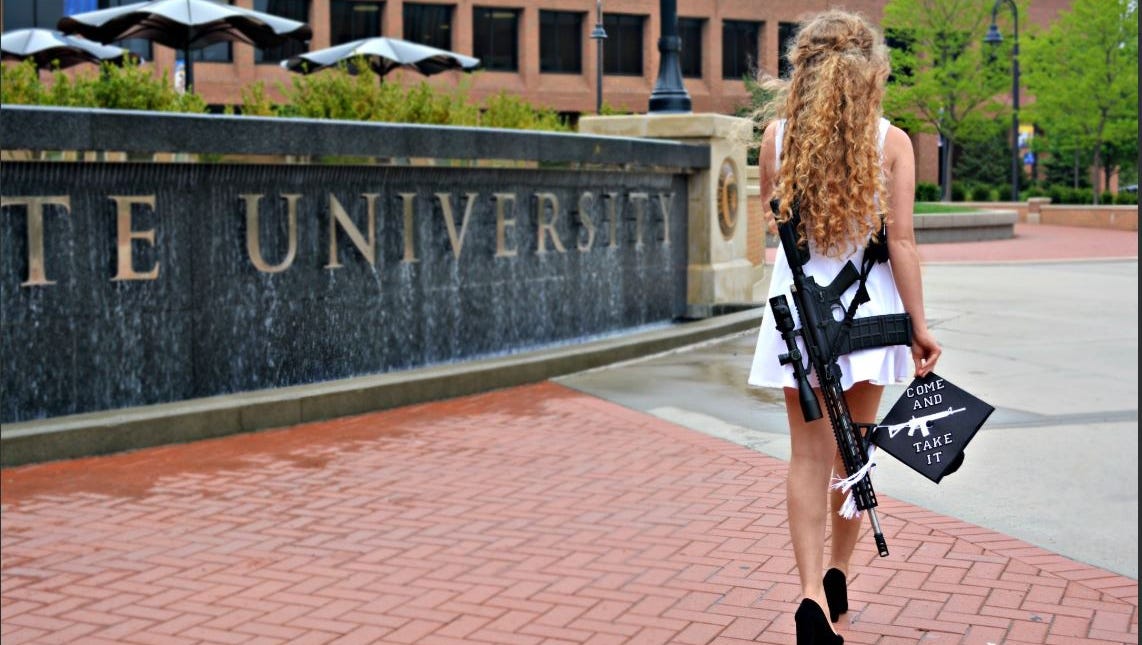 For those of you who don't know about her: she is known as the Gun Girl and made a name for herself carrying an AR-10 on campus (for the Kent State University in Ohio) to protest against the gun restrictions on that very campus. She cites the 2nd Amendment (as part of the US constitution) as one of the reasons for doing so, as well as an incident at the university that occurred in 1970 when some National Guardsmen opened fire on four unarmed students who were protesting against the bombing in Cambodia.